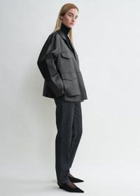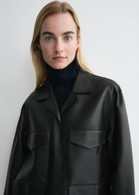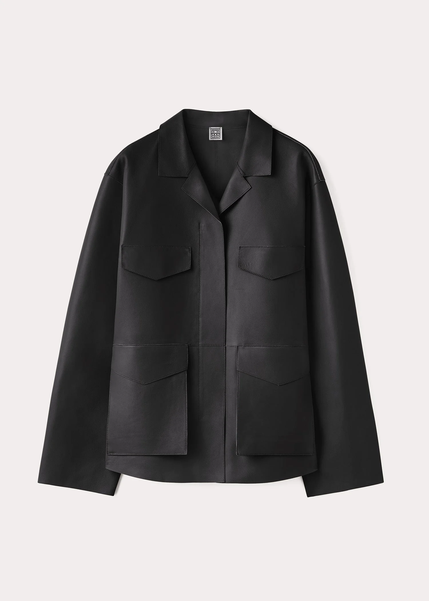TOTEME Army jacket reinterpreted in mid-weight sheepskin leather for everyday city edits. It has an oversized shape with a silver zipper, roomy flap pockets, and paneled sleeves. Wear it in trans-seasonal weather with a sweater and trousers. Details & Fit - Black - Four patch pockets - Silver-tone metal zipper - Cuff slits - 100% Lamb leather - Specialist clean - Style number 233-108-737 - The model is 178cm/510 tall and wears a size 34 - Oversized fit, consider taking a size down