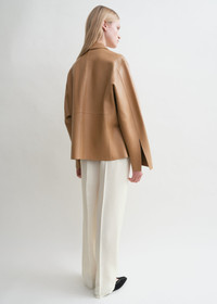TOTEME Army jacket reinterpreted in mid-weight sheepskin leather for everyday city edits. It has an oversized shape with a silver zipper, roomy flap pockets, and paneled sleeves. Add a sweater and jeans in trans-seasonal weather. Details & Fit - Camel - Four patch pockets - Silver-tone metal zipper - Cuff slits - 100% Lamb leather - Specialist clean - Style number 233-108-737 - The model is 178cm/510 tall and wears a size 34 - Oversized fit, consider taking a size down