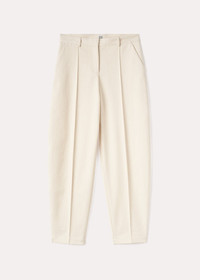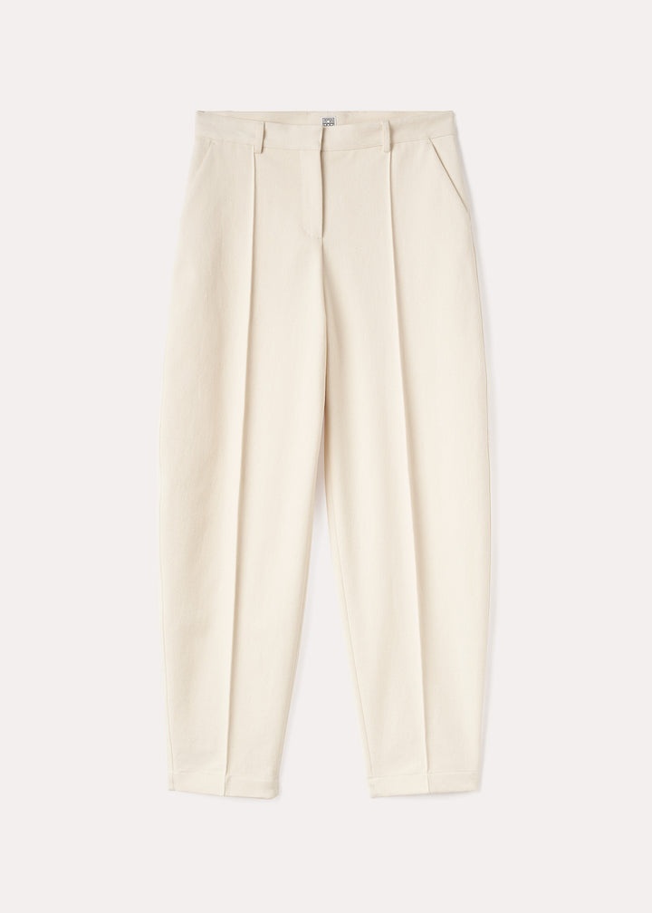 TOTEME trousers tailored to a relaxed silhouette structured with pressed creases. They have a low-to-mid waist with a low crotch and feature belt loops, a hook and zipper front, as well as side and back pockets. Wear them with a tucked-in top to spotlight the wide barrel leg, which is slightly curved towards the ankles. Details and fit - Ecru - Belt loops - Side and back pockets - Zipper front - 100% Organic cotton - Dry clean - Style number 232-2034-241 - The model is 177cm/5'8" tall and wears a size 34 - True to size