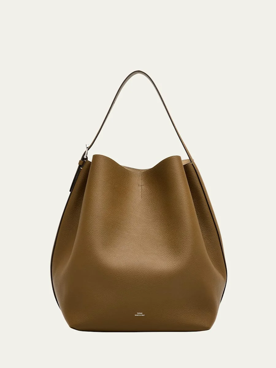Toteme tote bag in light, soft and fluid leather Adjustable metal belt shoulder strap, 11.4" drop Open top with hook closure Interior, two slip pockets Resincoated interior Lining: Polyurethane Approx. 14.5"H x 13.4"W x 10.6"D Made in Italy