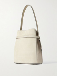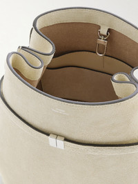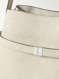 TOTEME's tote is as sleek and elevated as you'd expect. Crafted from soft suede, it has a curved bucket design with a tonal 'belt' that cinches the shape. Stow your phone, sunglasses and wallet in the spacious compartments. Details & Care - Off-white suede (Calf), black leather - Top handle - Three internal compartments - Unlined - Clasp fastening at open top - Designer color: Peark - Comes with dust bag - Weighs approximately 2.2lbs/ 1kg