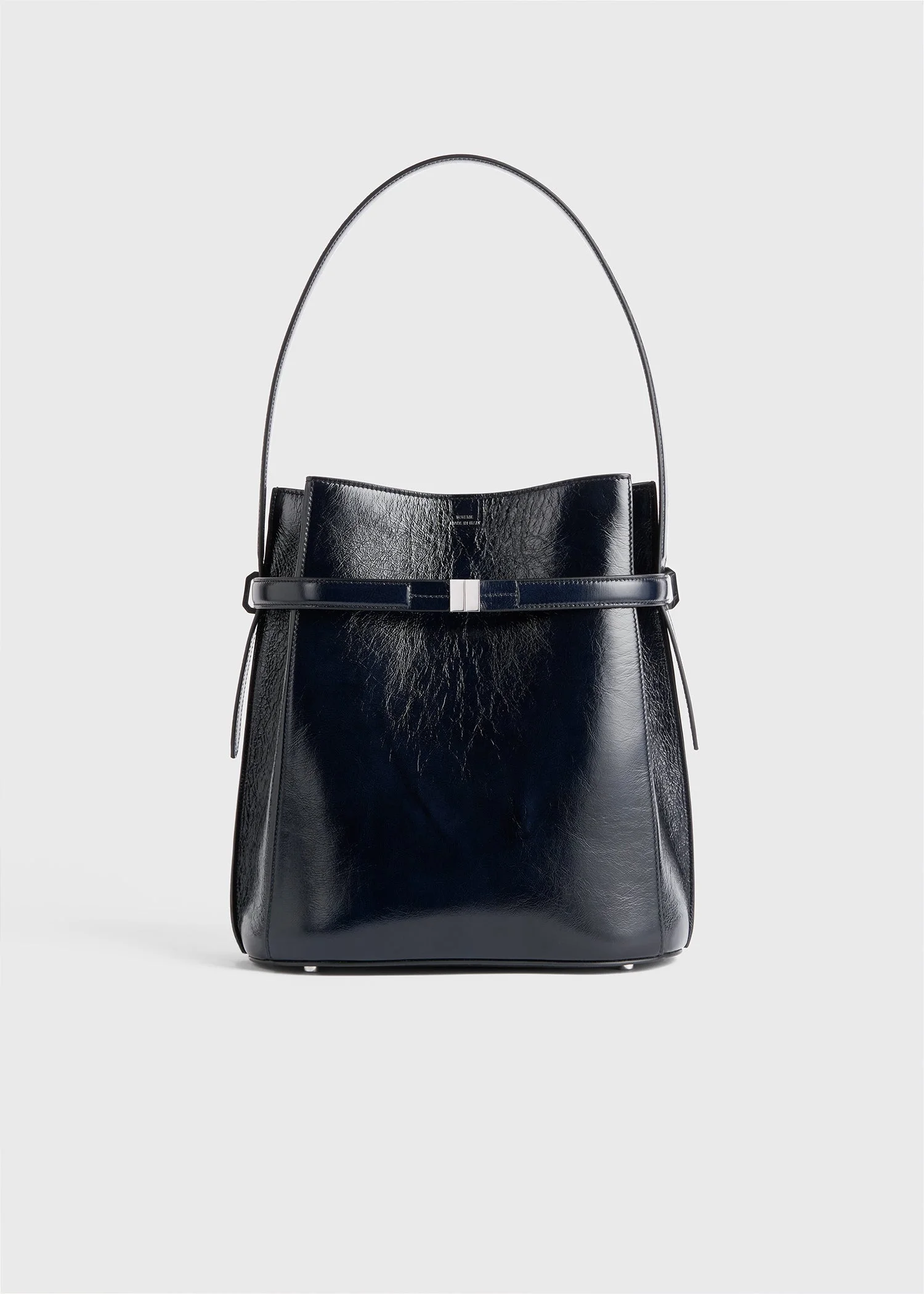 The Belted buckle bag debuted on the Fall Winter 24 runway, marking TOTEME's 10th anniversary. Crafted in Italy from lightly crinkled Naplack leather trimmed with silver-tone hardware, it features an elegant belt to cinch the flattened bucket silhouette or leave open for extra space, and is fitted with two internal slip pockets. Wear it in the city, suspended from the shoulder strap. Details & Fit - Navy - Silver-tone metal hardware - Fixed shoulder strap, front strap can be opened - Microsuede lining, two slip pockets - 100% calf leather; lining: 60% polyamide, 40% polyurethane - Care instructions and dust bag included - Style number 244-WAL0048-LE0020 - Strap drop 21cm/8.7" - Height 30cm/11.8" - Width 27cm/10.6" - Depth 15.5cm/6"