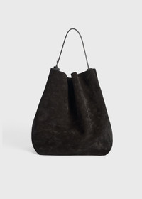 TOTEME tote bag crafted in Italy from light and supple suede that drapes naturally next to the body. It has an adjustable strap with a silver-tone metal buckle matching the Slim trouser leather belt and opens with a small clasp to a resin-coated interior with two pockets. Please note that this piece is crafted from dyed suede, which is naturally prone to color transfer when rubbed against light-colored garments or exposed to water. Details & Fit - Espresso brown - Adjustable strap - Silver-tone metal hardware - Beige resin-coated interior, two slip pockets - 100% Cow leather - Care instructions and dust bag included; note the dyed suede may produce crocking or bleeding when in contact with light-colored or wet surfaces - Style number 234-WLGBG038-LE0004 - Strap drop length: adjustable (29cm/11.4" on middle hole) - Height 37cm/14.5" - Width 34cm/13.4" - Depth 27cm/10.6"