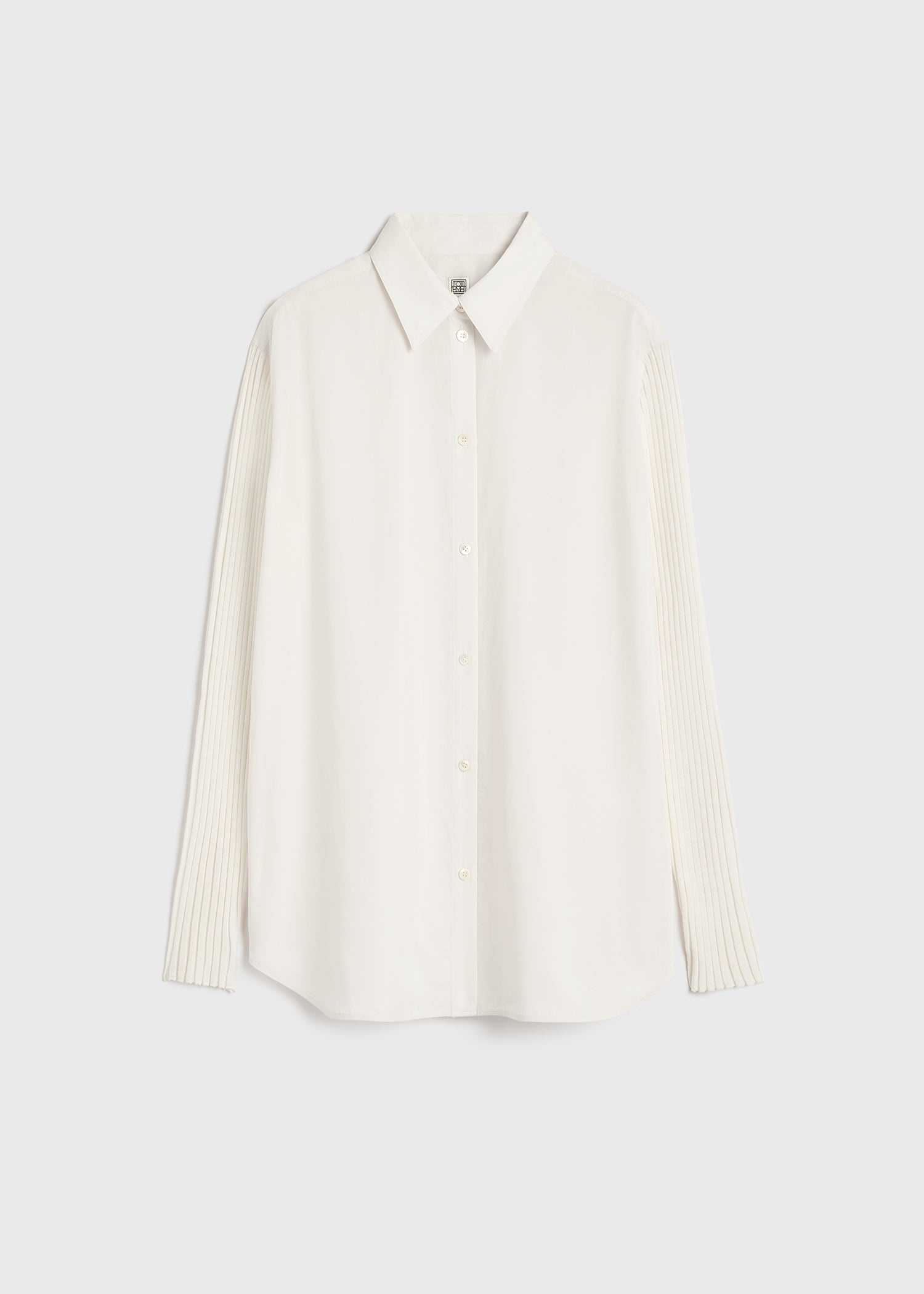 TOTEME piece blurring the lines between a shirt and a sweater. The relaxed, button-fastened body is made from a soft and fluid Lyocell blend and the long sleeves are rib-knitted from a warm merino-wool blend. Team it with trousers for a meeting. Details & Fit - Snow - Buttoned placket - 65% Lyocell, 35% polyester; sleeves: 78% wool 22% elastane - Cool hand wash - Style number 241-WRT1008-FB0071 - The model is 179cm/5'10" tall and wears a size 36 - True to size, relaxed fit