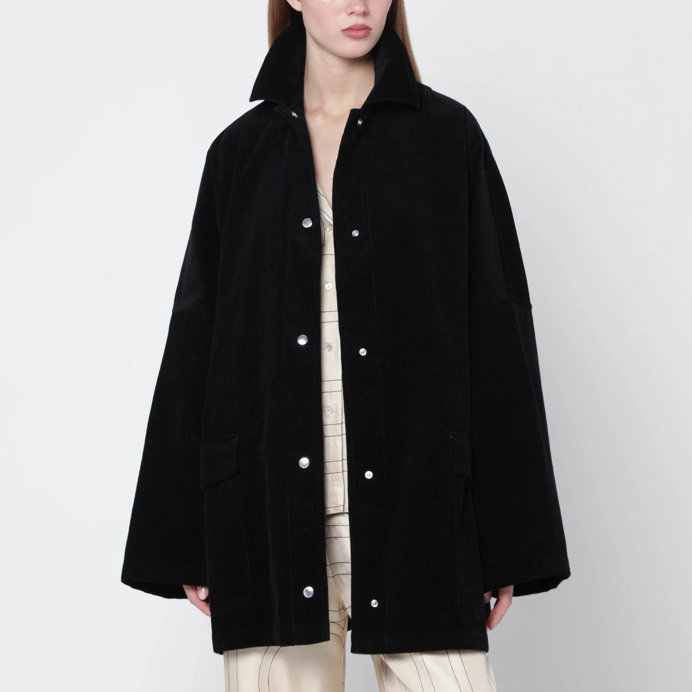 Jacket by TOTEME in black organic cotton corduroy• Silver-tone metal snap-button closure• Wide long sleeves with dropped shoulders• Two front flap patch pockets• Shirt-style collar• Loose fit
