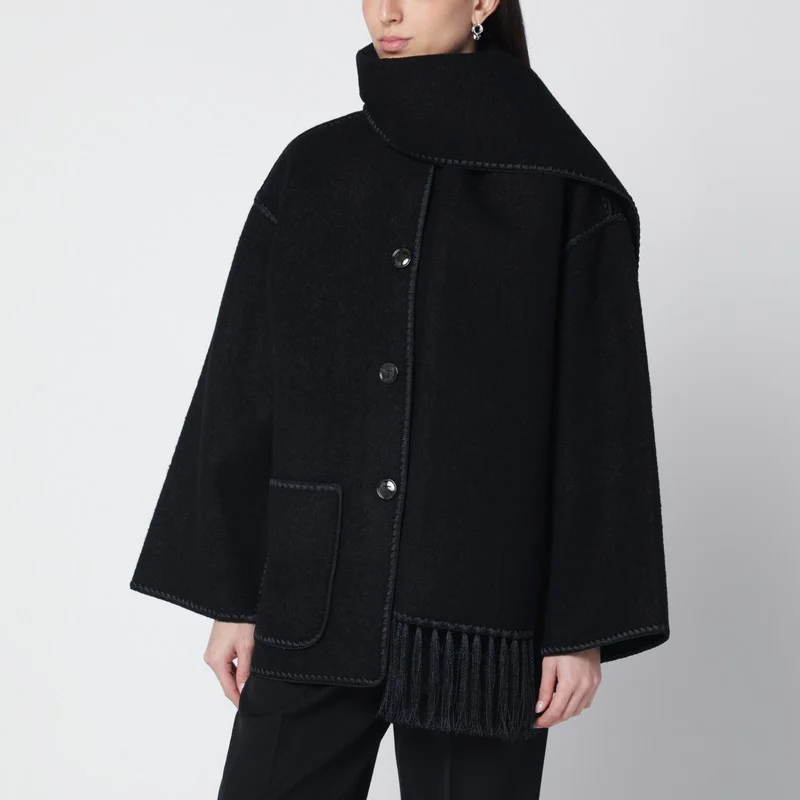 Black wool-blend jacket by TOTEME with fringed scarf, featuring long wide sleeves, two front patch pockets, oversized fit with dropped shoulders, and tonal embroidered details.