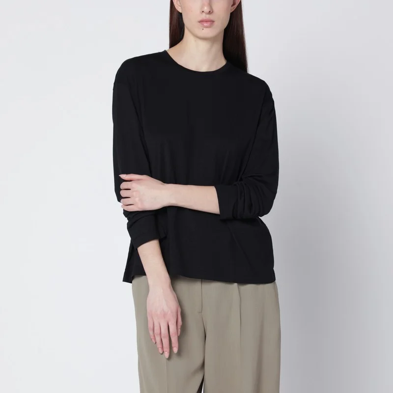Black organic cotton-blend crewneck top by TOTEME with long sleeves.
