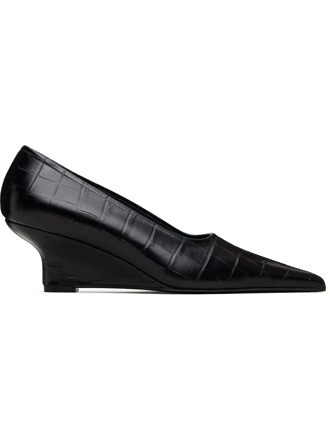 Croc-embossed leather heels. · Pointed toe · Buffed sheepskin lining · Wedge heel with rubber injection · Leather sole · Heel: H2.25" Supplier color: Black Leather. Made in Italy 261771F122003