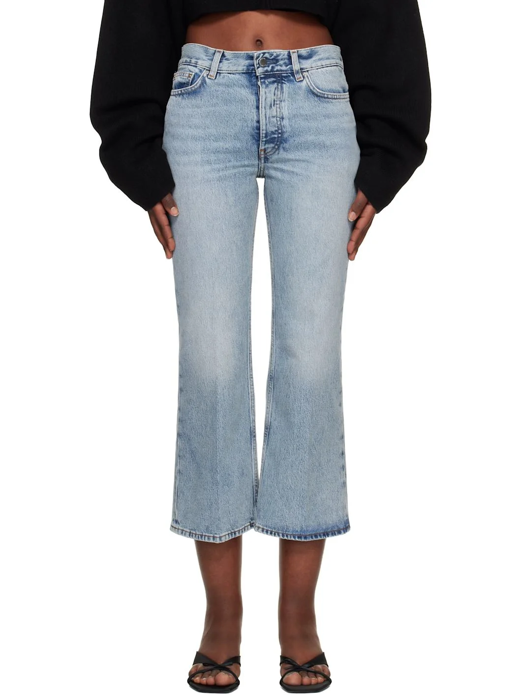Non-stretch organic cotton denim jeans. · Fading and whiskering throughout · Flared · Low-to-mid rise · Belt loops · Five-pocket styling · Button fly · Creased legs · Logo patch at back waistband · Logo-engraved silver-tone hardware · Contrast stitching in tan Supplier color: True vintage 100% organic cotton. Made in Italy 261771F069005