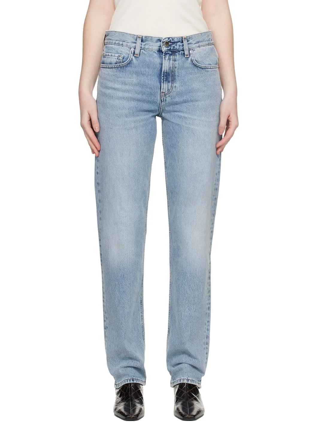 Non-stretch organic cotton denim jeans. · Fading and whiskering throughout · Straight-leg · Mid-to-low rise · Belt loops · Five-pocket styling · Zip fly · Leather logo patch at back waistband · Contrast stitching in tan Part of the Garderob collection. Supplier color: True Vintage 100% organic cotton. Made in Italy 261771F069003