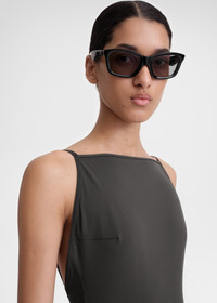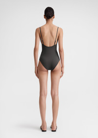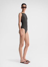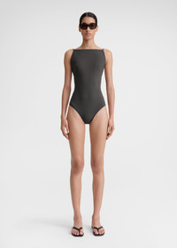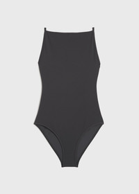 TOTEME swimsuit outlined with an elegant boat neckline and low back. It's suspended from slim stripes adjusted with silver-tone sliders and has medium-high legs as well as full tonal lining. Wear it with a tote and sandals on your way to the pool. Details & Fit - Anthracite - Adjustable straps, silver-tone metal sliders - Tonal lining - 71% polyamide recycled, 29% elastane; lining: 84% polyamide recyled, 16% elastane - 30°C Machine wash - Style number 242-WSW1772-FB0097 - The model is 175cm/5'9" tall and wears a size S - Slim fit, true to size