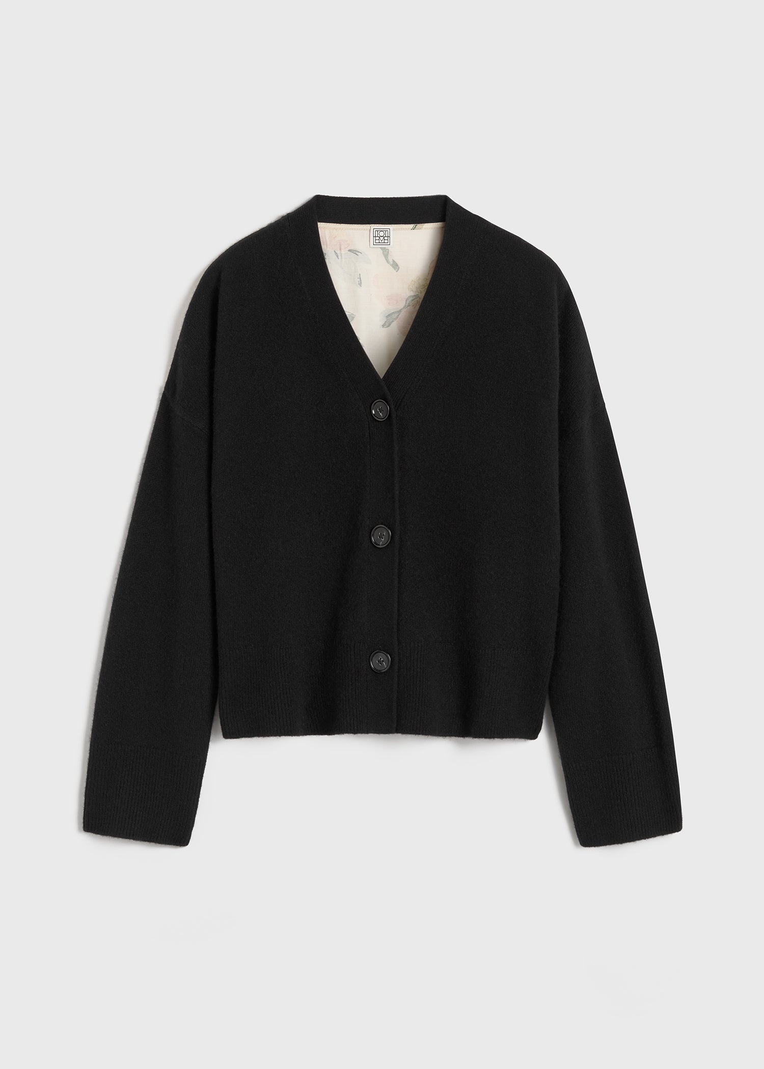 TOTEME cardigan set with a satin back panel printed with sun-kissed washed florals. It is knitted from mid-weight cashmere to an oversized, boxy shape finished with front buttons. Wear on the weekend with jeans. Details & Fit - Black - Button front - Floral-print satin back - 100% cashmere; back: 52% cupro, 48% silk - Cool hand wash - Style number 243-WRT0333-YA0016 - The model is 181cm/5'11 tall and wears a size S - Oversized fit, boxy shape