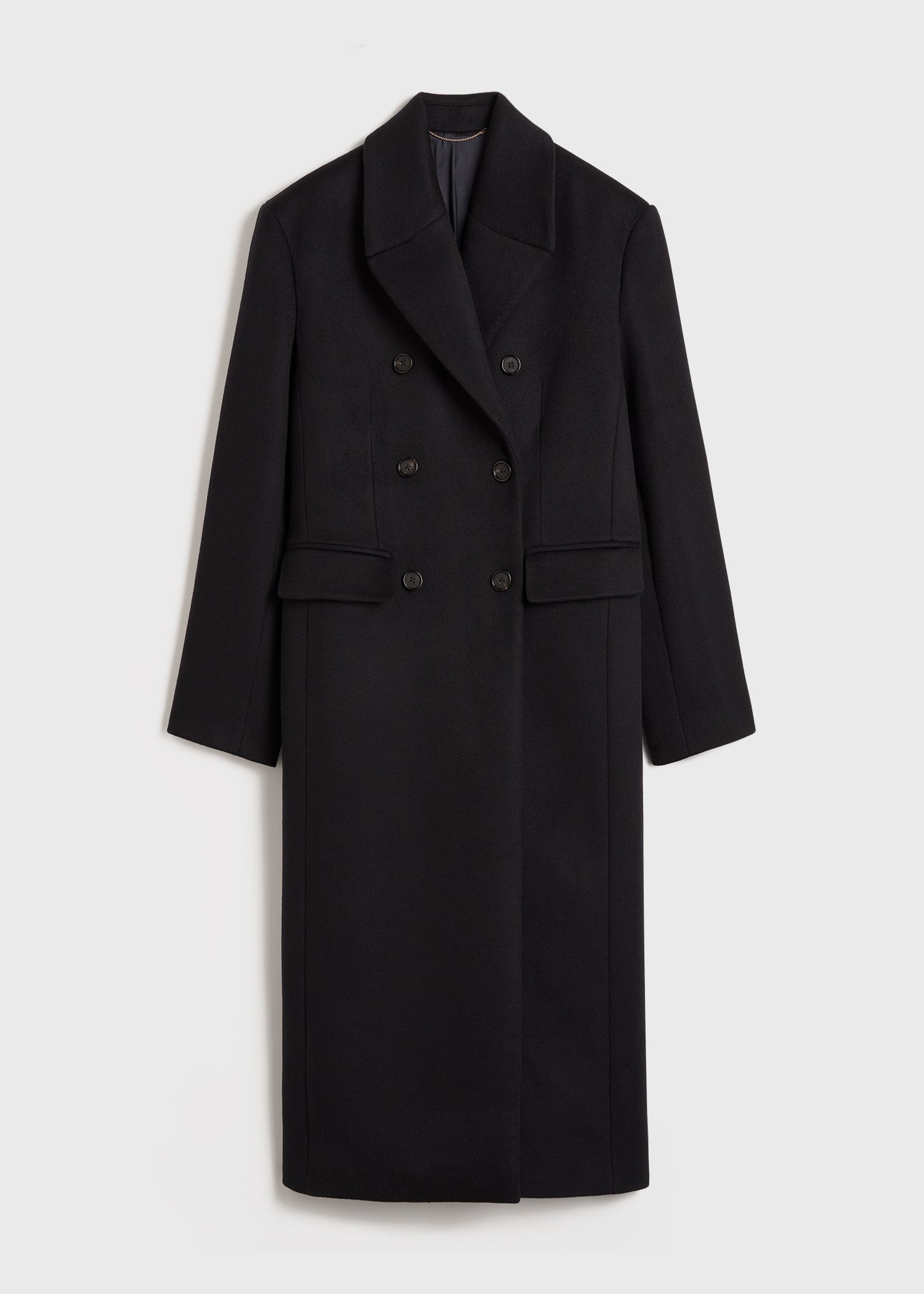 Long, oversized TOTEME Chesterfield-style coat impeccably tailored from soft cashmere double. It has broad, structured shoulders followed by a double-breasted button front and flap pockets, then opens to a soft and lustrous lining with an additional pocket. Button it up to highlight the tapered silhouette. Details & Fit - Midnight blue - Double-breasted button front - Flap pockets - Satin lining, internal pocket - 50% cashmere, 50% cashmere recycled; lining 100% viscoseDry clean - Style number 244-WRO0134-FB0313 - The model is 178cm/510 tall and wears a size 36 - Oversized fit, broad shoulders