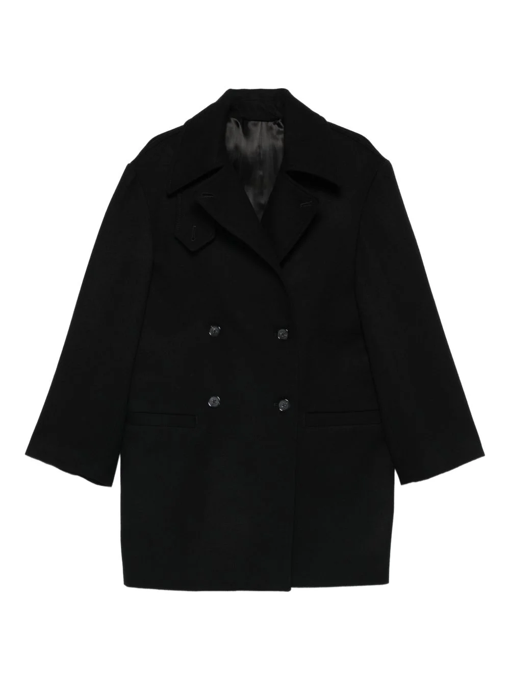 Broad double-breasted peacoat Highlights - Black - Double-breasted - Notched lapels - Button fastening - Long sleeves Imported Composition Outer: Wool 100% Lining: Viscose 100% SIZE & FIT Model measurements Height 5 ft 10 in(1.78 m) Bust/Chest 31.49 in(80 cm) Hips 37 in(94 cm) Waist 23.62 in(60 cm) Washing instructions Dry Clean Only