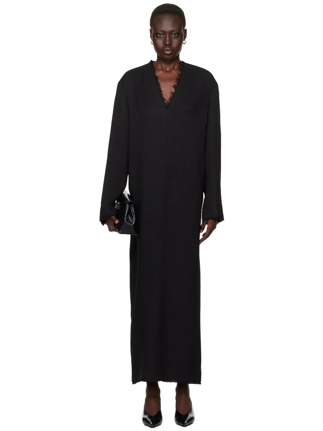 Viscose sable maxi dress. Raw edges throughout. · V-neck · Seam pockets · Button vent at cuffs · Central vent at back hem · Full satin lining Supplier color: Black Body: 100% viscose. Lining: 100% polyester. Made in Portugal 242771F054004