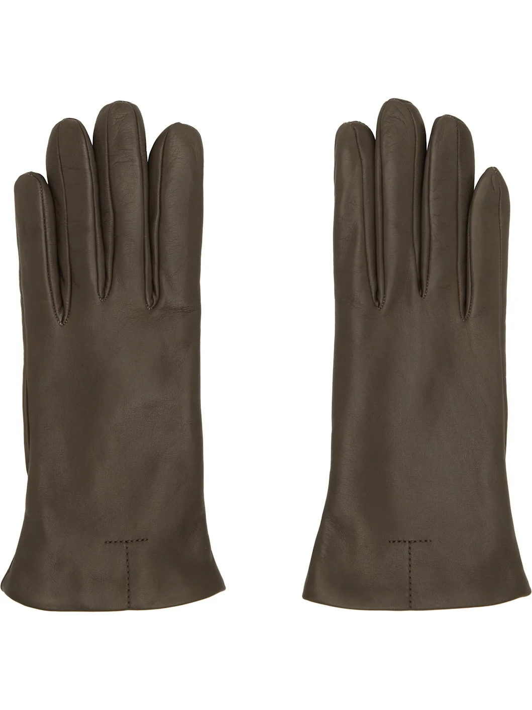 Pair of buffed nappa lambskin gloves. · Logo embroidered at top · Partially elasticized cuffs · Knit cashmere- and wool-blend lining Supplier color: Brown Body: 100% lambskin. Lining: 50% cashmere, 50% wool. Made in Italy 252771F012002