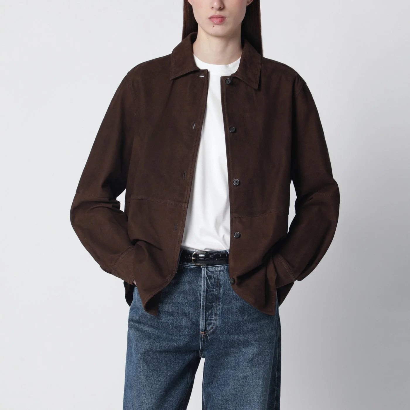 Shirt jacket by TOTEME in brown leather• Front button closure• Long sleeves with buttoned cuffs• Classic collar• Curved hem