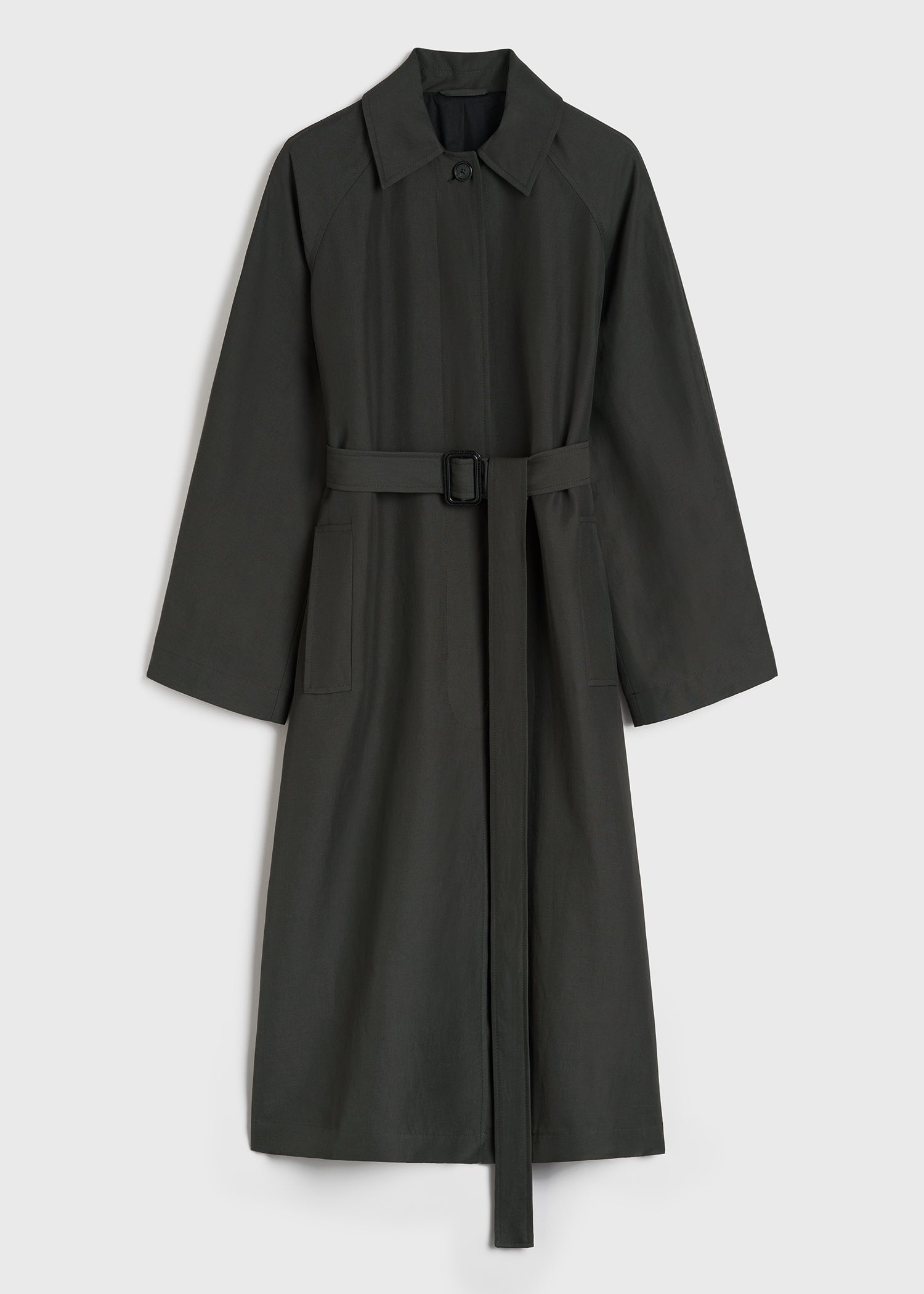 TOTEME summer trench coat defined with a long, oversized silhouette. It's made from a breathable viscose-and-linen blend with raglan sleeves, a buttoned front and a detachable belt for different wearing options. Complement the fluid drape with tailored trousers. Details & Fit - Anthracite - Concealed button placket - Detachable belt - Welt pockets - 64% viscose, 36% linen - Dry clean - Style number 242-WRO1587-FB0101 - The model is 175cm/5'9" tall and wears a size 36 - Relaxed fit, dropped shoulders