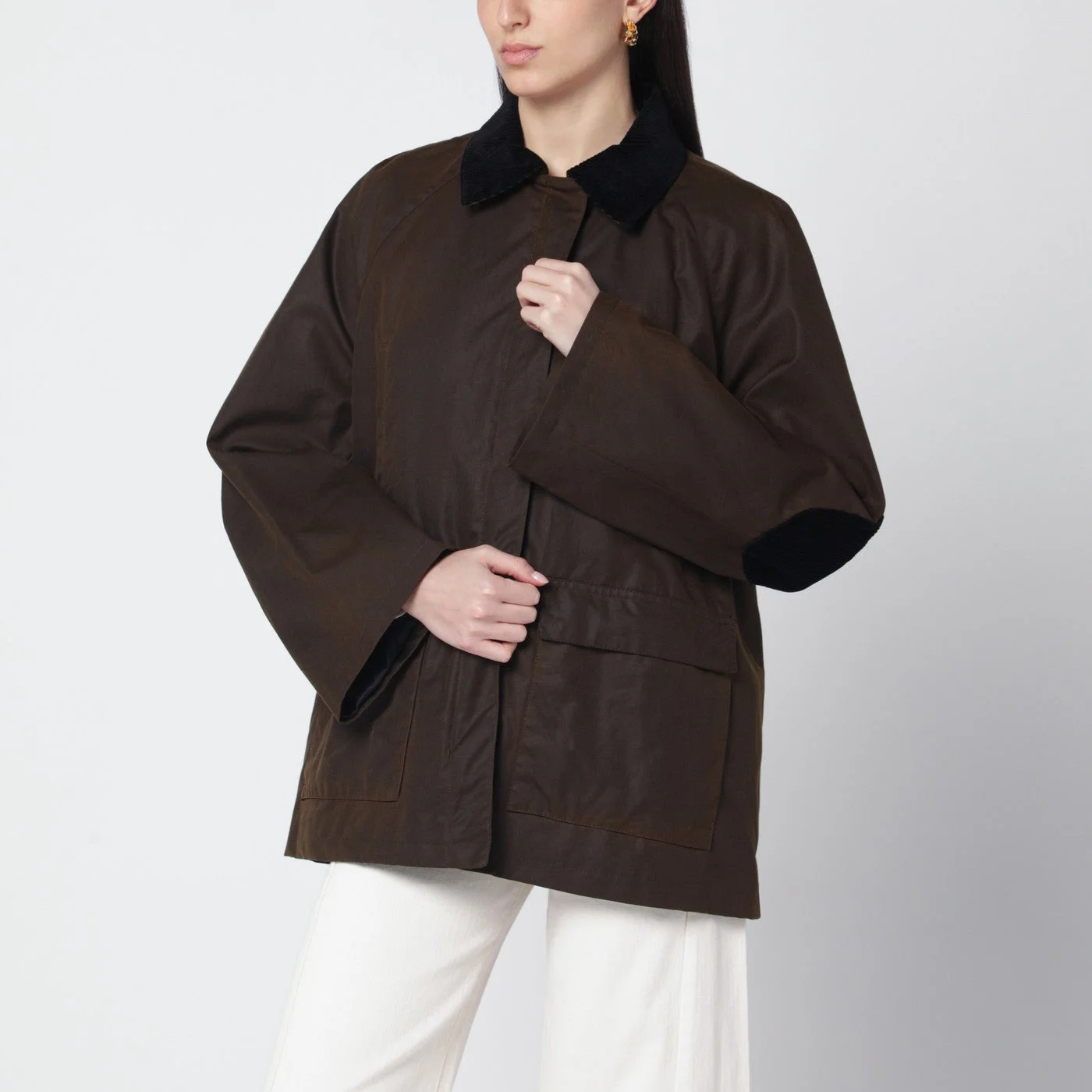Oversized country jacket by TOTEME in brown waxed cotton• Trapeze silhouette• Black corduroy collar• Elbow patches• Front zip closure• Snap buttons• Front pockets
