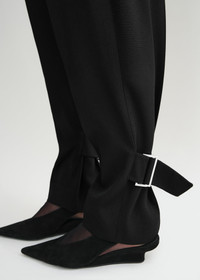 TOTEME trousers shaped with extra-long, barrel-shaped legs that slouch at the ankles with the help of rectangular silver-tone rings. They are made from a softly grained fabric with belt loops, side and back pockets and a button fly. Wear them with a light top for contrast. Details & Fit - Black - Belt loops - Side and back pockets - Zipper fly - 60% wool RWS, 40% polyester recycled - Dry clean - Style number 244-WRB0213-FB0314 - The model is 180cm/5'11 tall and wears a size 36 - True to size, relaxed, slouching legs