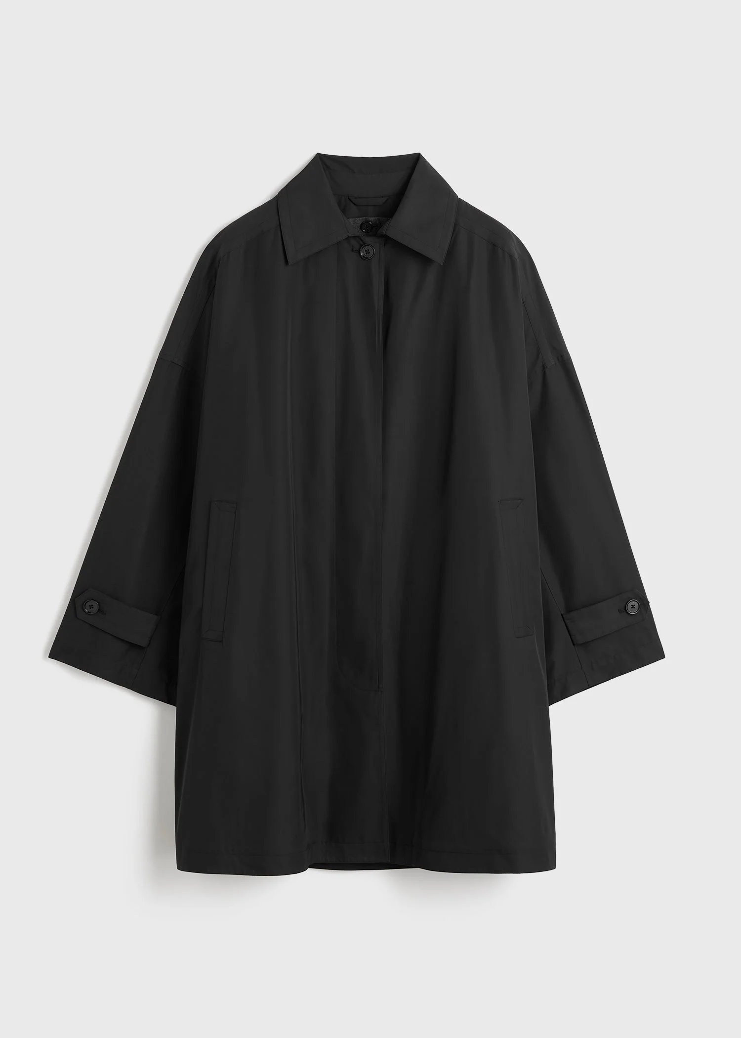 Designer's note: "Our take on the classic car coat. It's woven from weather-resistant nylon with an oversized A-line silhouette and extra low shoulders. The detachable ripstop lining makes it versatile in different climates." Details - Black - Concealed button front, buttoned cuff tabs - Welt pockets - Detachable lining - 100% recycled polyester; lining: 100% cotton - Dry clean - Style number 254-WRO0300-FB0627 Fit information - The model is 180cm/5'11” tall and wears a size 36 - Oversized fit, A-line silhouette Origin & Certificates - Country of origin: Lithuania - Manufacturer: Dainava UAB