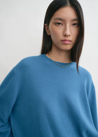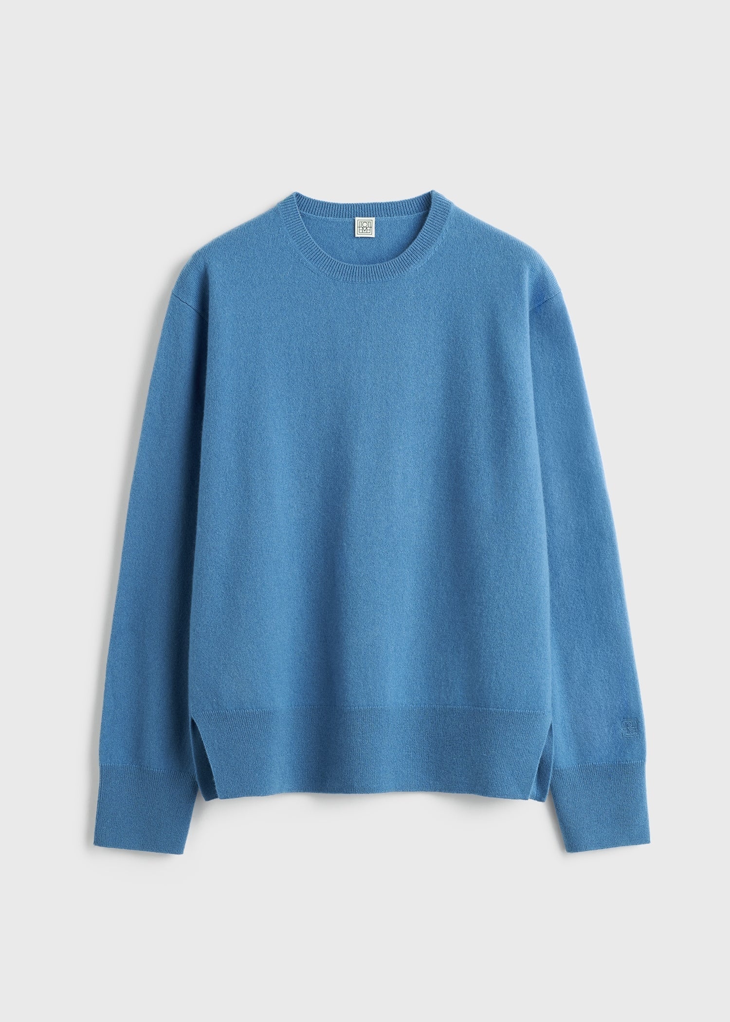 Updated in a sublime shade of azure blue, this TOTEME sweater is knitted from light cashmere with a soft hand feel. It has a classic, relaxed fit with a crew neckline and side hem slits for a natural drape. Look closer to find a monogram embroidered into the left sleeve. Details & Fit - Azure - Embroidered monogram - Side-hem slits - 100% cashmere - Cool hand wash - Style number 252-WRT1734-YA0016 - The model is 180cm/5'11 tall and wears a size S - True to size, regular fit