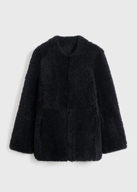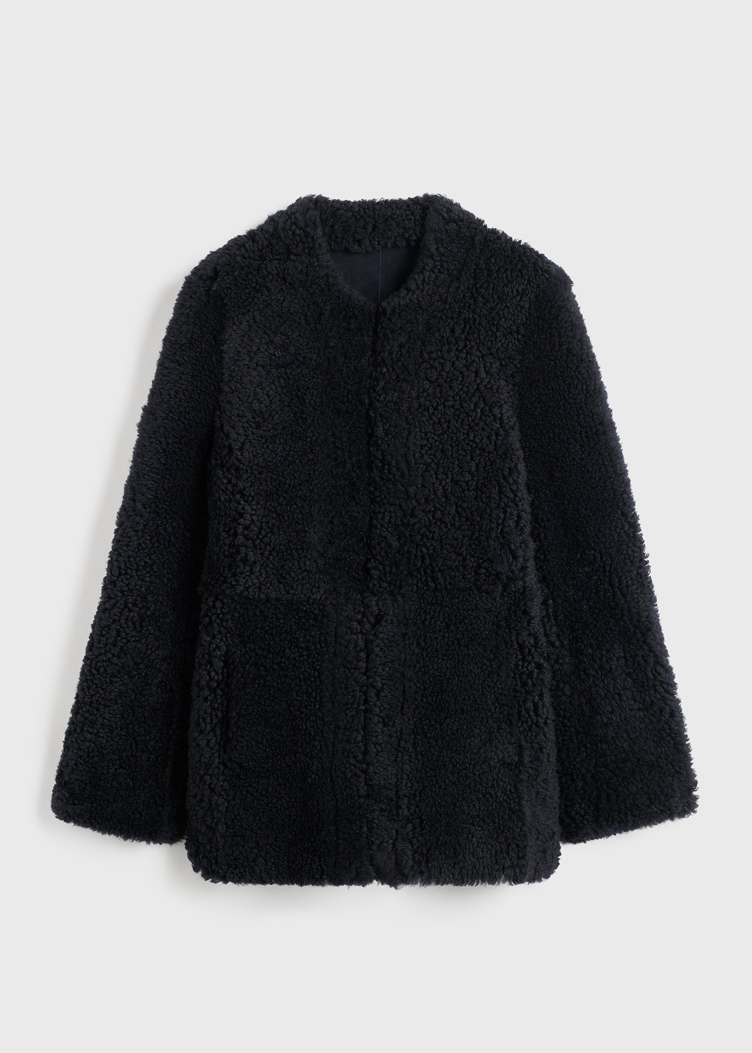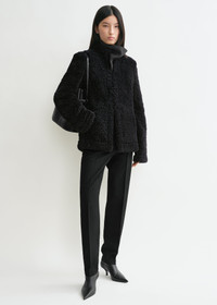 TOTEME jacket presented in the new bubbly Astrakhan shearling, which has a curly texture and soft hand feel for an elevated take on winter dressing. It has a longline, slim silhouette fastened with concealed front hooks and fitted with practical side pockets. Wear it with dark separates. Details & Fit - Navy - Hook and eye fastening - Side slip pockets - Suede interior - 100% lamb shearling - Specialist clean - Style number 244-WRO0153-LE0095 - The model is 180cm/5'11 tall and wears a size 36 - True to size, slim fit