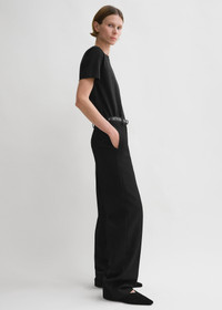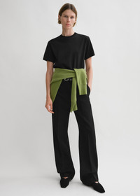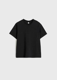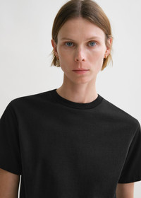 New TOTEME T-shirt cut to a scaled-down, boxy silhouette for a classic fit. It is made from organic-cotton jersey with a round neck and short sleeves. Tie a sweater over the waist for contrast. Details & Fit - Black - 100% organic cotton - 30°C Machine wash - Style number 243-WRT0344-FB0092 - The model is 176cm/59 tall and wears a size S - True to size, regular fit
