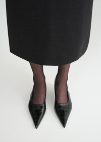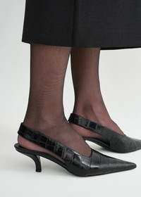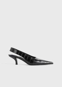 A modern interpretation of classic pumps, this new TOTEME style comes with bold slingback straps evoking confident brushstrokes. Made in Italy from croco-embossed leather, they are contoured with our signature sharp point toe and rest on a tapered 55mm kitten heel. Wear them as a complement to occasion looks. Details & Fit - Black - Slingback strap, elastic insert - Leather lining, padded insole - Leather sole - 100% cow leather; lining: 100% sheep leather; sole: 100% cow leather - Care instructions and dust bag included - Style number 251-WAS0205-LE0076 - Average heel height 55mm/2.2." proportional to shoe size - True to size