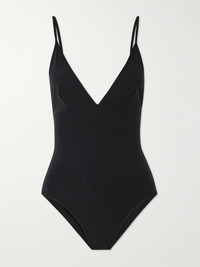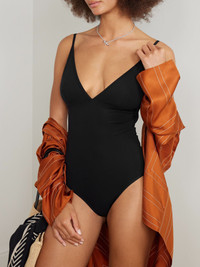 TOTEME’s swimwear is renowned for precise, minimalist cuts and high-quality, comfortable fabrics. This swimsuit is made from stretch fabric blended with 29% recycled fibers and has a deep, V-neckline and open back framed by slim ties. Size & Fit - Fits true to size, take your normal size - Fully adjustable shoulder straps - Medium brief coverage - Model is 175cm/ 5'9", bra size 32C and is wearing a size XSmall Model measurements: - Bust: 80cm/ 31.5" - Waist: 60cm/ 24" - Hip: 89cm/ 35" Details & Care - Black stretch-polyamide - Ties at back - 43% polyamide, 29% recycled polyamide, 28% elastane - Machine wash - Lotion, sunscreen, oil and chlorine can cause discoloration of this item; this is not a manufacturing defect. Please follow care instructions to keep your swimwear in the best condition