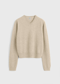 TOTEME sweater conceived with a classic V-neckline and a regular fit. It is knitted from featherlight and soft cashmere yarns and subtly ribbed along the edges. Note the inconspicuous monogram embroidered on the sleeve. Details & Fit - Fawn - Embroidered monogram - Ribbed edges - 100% cashmere - Cool hand wash - Style number 252-WRT0432-YA0016 - The model is 178cm/510 tall and wears a size S - True to size, regular fit