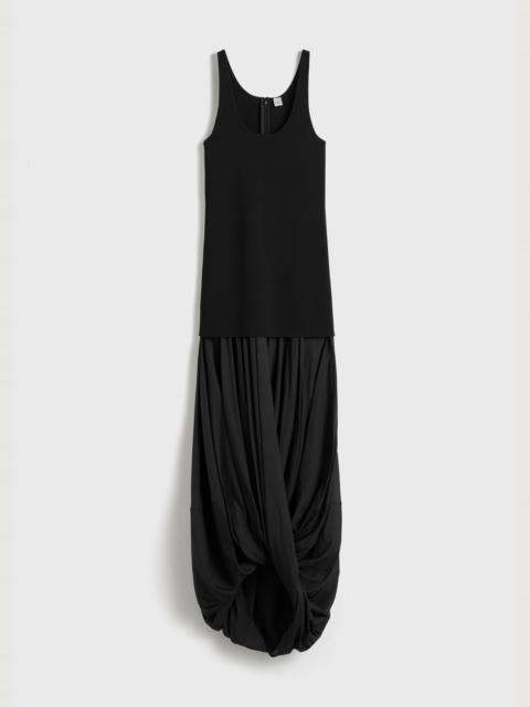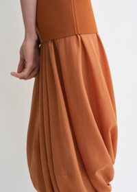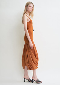 TOTEME dress featured on the Summer 25 runway, taking place at New York Fashion Week. It consists of a long tank top made from compact jersey and followed by twisted panels inspired by cocoons. Add a pair of heeled sandals to attend an open-air event. Details & Fit - Terracotta - Knitted top, concealed back zipper - Twisted skirt - Mid-weight knit, light skirt - 53% viscose, 45% polyamide recycled, 2% elastane; skirt: 60% lyocell, 40% cotton organic - Dry clean - Style number 253-WRD0212-YA0187 - The model is 178cm/510 tall and wears a size 36 - True to size, long torso with a slim fit