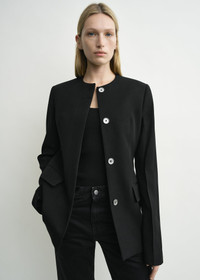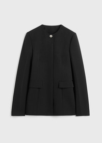 Designer's note: "A collarless suit jacket that epitomizes our appreciation for well-structured tailoring. This piece has has a slim silhouette cinched at the waist with long darts. Note the partially concealed placket, which fastens with elegant silver-tone buttons." Details & Fit - Black - Partially concealed placket, silver-tone buttons - Flap pockets - Satin lining - 93% viscose, 7% polyamide - Dry clean - Style number 244-WRO0145-FB0315 - The model is 180cm/5'11 tall and wears a size 36