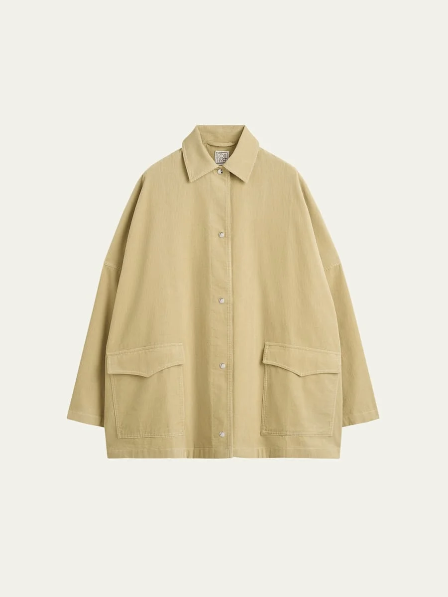 Toteme overshirt jacket is crafted from soft corduroy accented with silvertone snap buttons Point collar; singlebreasted front Long sleeves Drop shoulders Hip flap patch pockets Oversized fit Hem falls below the hip Polyester/wool Made in Portugal