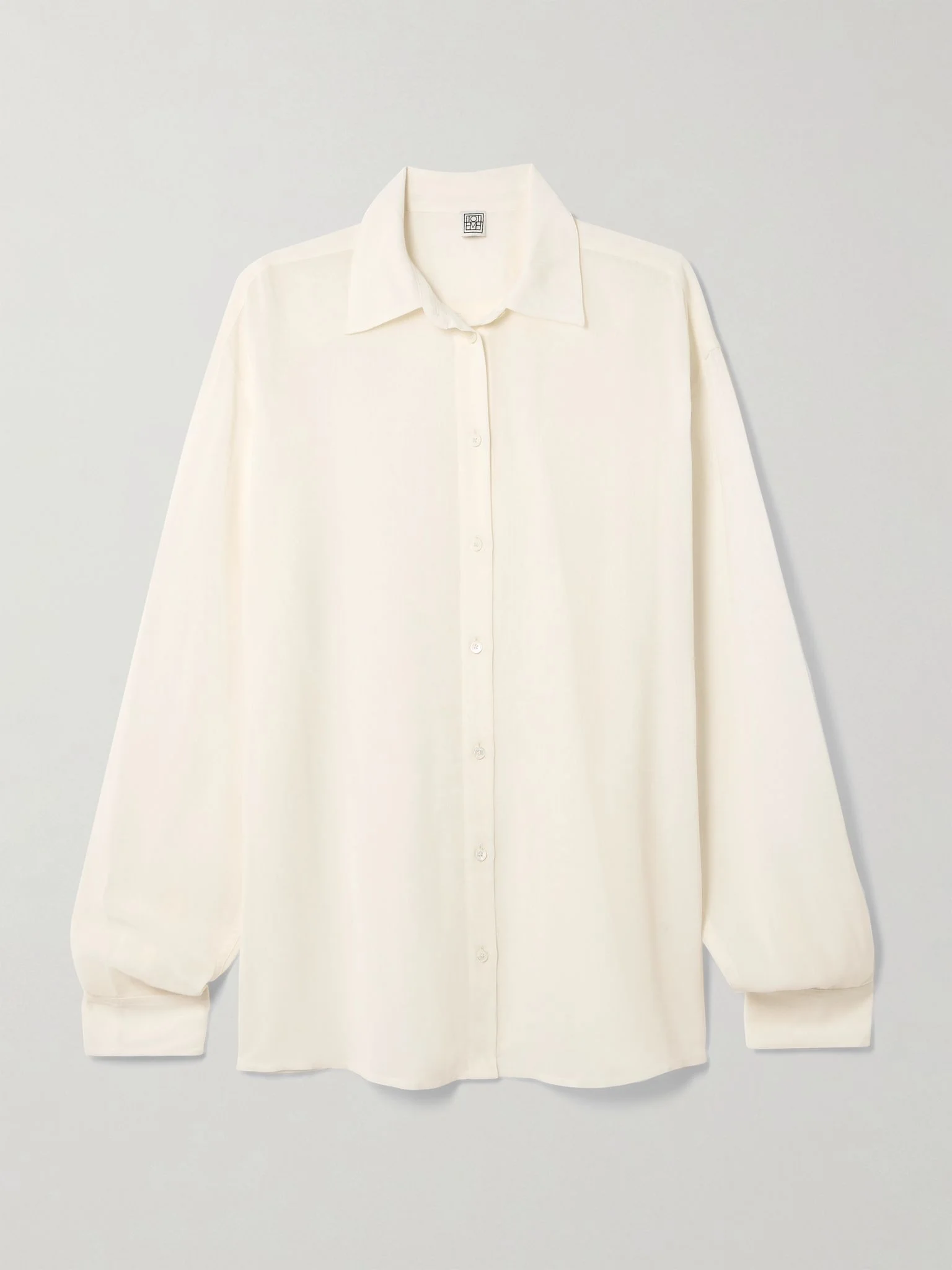 TOTEME's shirt is a classic style you'll wear with everything from jeans to tailoring or skirts. Cut from airy voile, it's blended with a touch of wool and has a relaxed fit emphasized by dropped shoulders. Size & Fit TOTEME follows its own size guide, please refer to below: - DK 32 = UK 4/ US 0/ IT 36 - DK 34 = UK 6/ US 2/ IT 38 - DK 36 = UK 8/ US 4/ IT 40 - DK 38 = UK 10/ US 6/ IT 42 - DK 40 = UK 12/ US 8/ IT 44 - DK 42 = UK 14/ US 10/ IT 46 - Fits true to size, take your normal size - Designed for a relaxed fit - Mid-weight, non-stretchy fabric - Model is 177cm/ 5'10" and is wearing a DK 36 Model measurements: - Bust: 78cm/ 31" - Waist: 62cm/ 24.5" - Hip: 92cm/ 36" Details & Care - White voile - Button fastenings through front - 83% viscose, 17% wool - Designer color: Milk