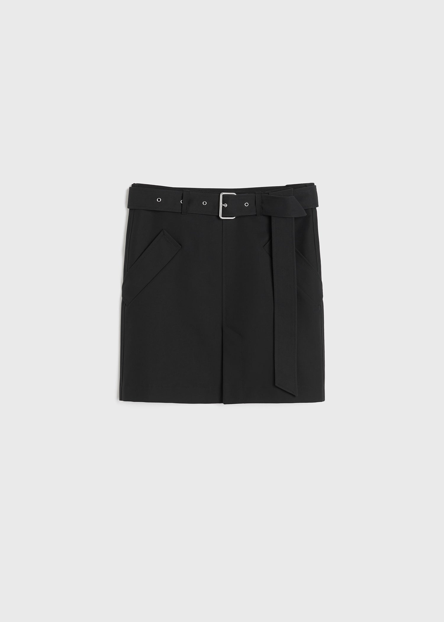 TOTEME mini skirt borrowing elements from classic trench coats and biker jackets . It's made from compact cotton with a detachable belt and wide welt pockets, then fastens with a concealed back zipper. Add a tonal top to complete a monochromatic edit. Details & Fit - Black - Detachable belt, silver-tone hardware - Slanted welt pockets - Concealed back zipper - 100% cotton organic - 30°C Machine wash - Style number 242-WRB1740-FB0100 - The model is 178cm/510 tall and wears a size 36 - Regular fit, true to size