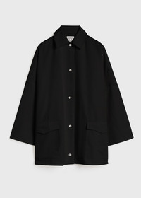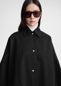 TOTEME hybrid between a jacket and an overshirt. It's made from mid-weight cotton twill to an oversized shape with dropped shoulders, silver-tone press buttons and flap pockets. Wear it as an effortless outerwear piece throughout a summer trip. Details & Fit - Black - Silver-tone snap buttons - Flap pockets - 100% organic cotton - 30°C Machine wash - Style number 241-WRO1050-FB0103 - The model is 178cm/510 tall and wears a size 36 - Extra oversized fit, consider taking one or two sizes down