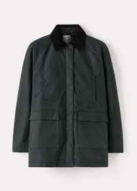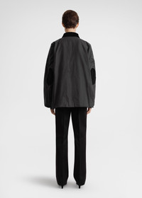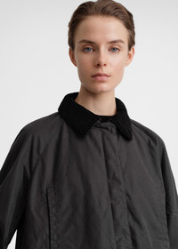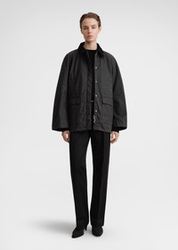 Oversized TOTEME jacket made from waxed cotton sourced from British heritage weavers. It’s designed with a very spacious A-line silhouette complete with a corduroy collar and elbow patches, a zipper and snap-button front, and flap and welt pockets. Wear it as intended or take a smaller size for a more true-to-size look. Details & Fit - Washed black - Contrasting corduroy collar and elbow patches - Welt and flap pockets - Concealed zipper and snap-button front - Quilted lining - 100% Cotton; lining: 100% viscose; filling: 100% polyester - Specialist clean - Style number 224-1017-731 - The model is 179cm/5'10" tall and wears a size 36 - Designed for an oversized fit, go down one or two sizes for a more true-to-size look