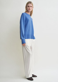 TOTEME sweater knitted from light cashmere with a soft hand feel. It has a classic, relaxed fit with a crew neck and side slits at the hem for a natural drape. Look closer to find a monogram embroidered into the left sleeve. Details & Fit - Cornflower - Embroidered monogram - Side-hem slits - 100% cashmere - Cool hand wash - Style number 253-WRT0496-YA0016 - The model is 178cm/510 tall and wears a size S - True to size, regular fit