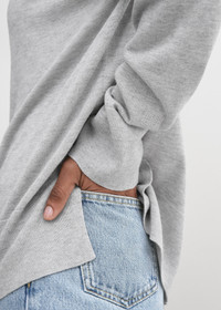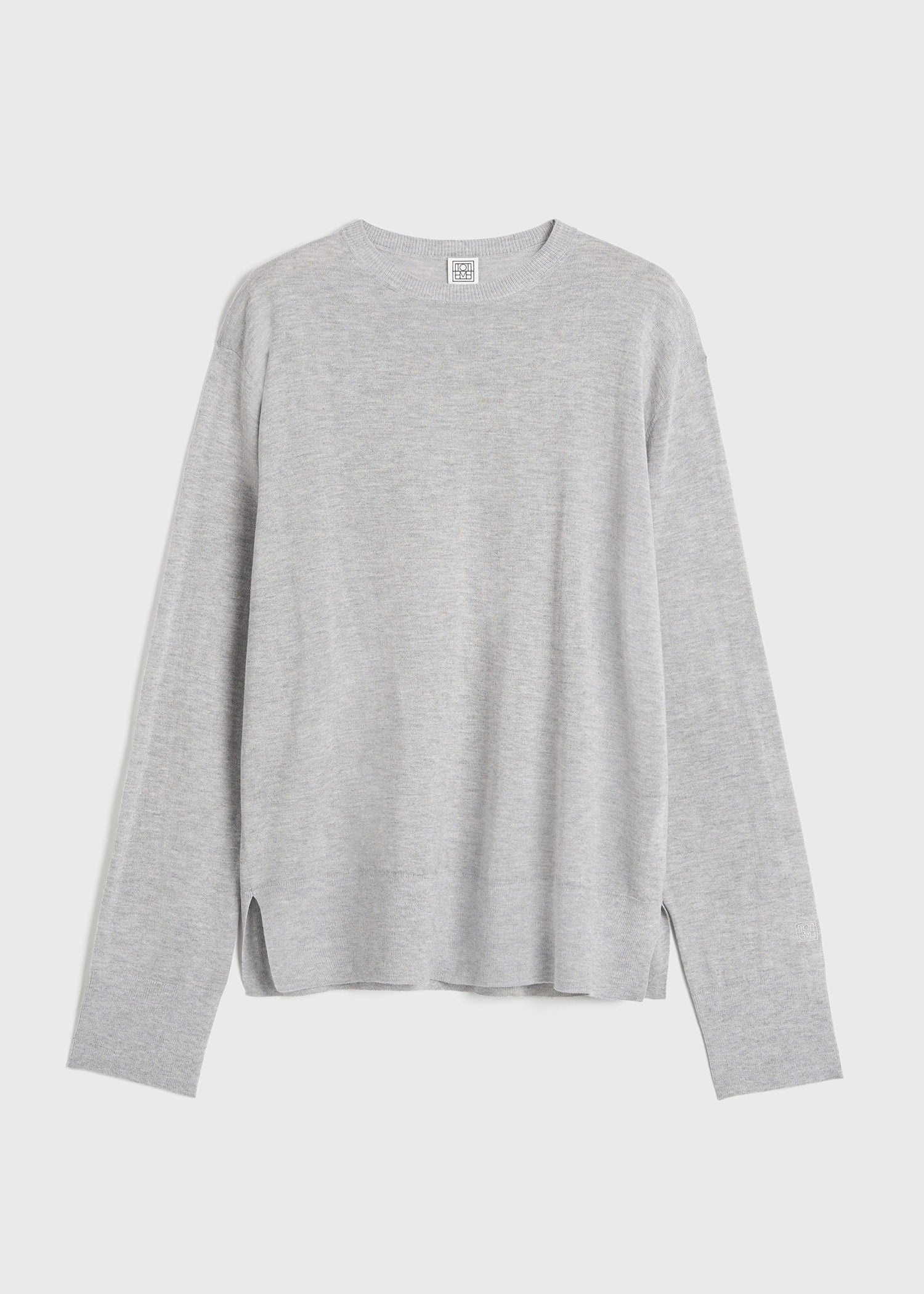 TOTEME sweater knitted from a silk blend with a fine and light sensation that is perfect for the summer months. It has a classic, relaxed fit with a crew neck and side slits at the hem for a natural drape. Look closer to find a monogram embroidered into the left sleeve. Details & Fit - Grey - Embroidered monogram - Side-hem slits - 80% silk, 15% cashmere, 5% polyamide - Cool hand wash - Style number 243-WRT0346-YA0084 - The model is 180cm/511 tall and wears a size S - Regular fit, true to size