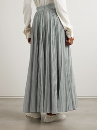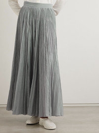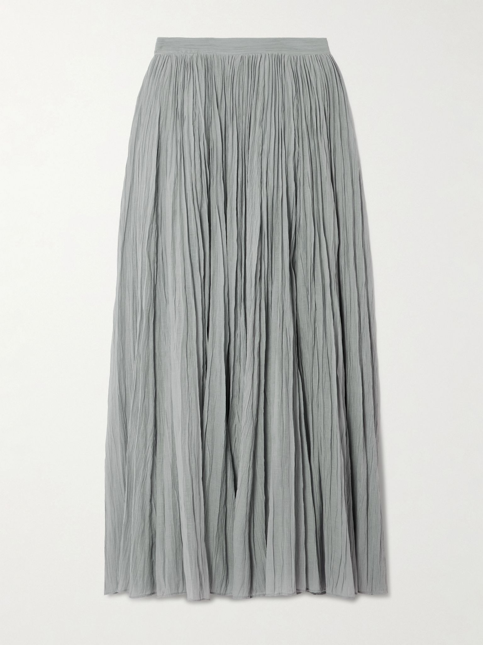 TOTEME has mastered the art of effortless dressing. Made from organic cotton-blend, this skirt has a plisse texture and flowy pleats that create pretty movement when you walk. Wear yours with everything from a tucked-in top to an oversized sweater. Size & Fit TOTEME follows its own size guide, please refer to below: - DK 32 = UK 4/ US 0/ IT 36 - DK 34 = UK 6/ US 2/ IT 38 - DK 36 = UK 8/ US 4/ IT 40 - DK 38 = UK 10/ US 6/ IT 42 - DK 40 = UK 12/ US 8/ IT 44 - DK 42 = UK 14/ US 10/ IT 46 - Fits true to size, take your normal size - Maxi-length, designed to be worn just below the natural waist - Lightweight, non-stretchy fabric - Model is 180cm/ 5'11" and is wearing a DK 36 Model measurements: - Bust: 80cm/ 31.5" - Waist: 65cm/ 25.5" - Hip: 89cm/ 35" Details & Care - Gray plisse-organic cotton-blend - Concealed hook and zip fastening at back - 72% organic cotton, 28% polyamide - Dry clean