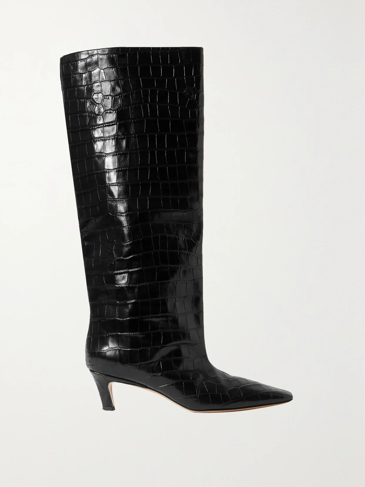 Guided by minimalist and modern art, Toteme's designs tend to be simple yet striking. These knee boots are made from croc-effect leather with a glossy luster. They have squared toes and wide-cut brims.