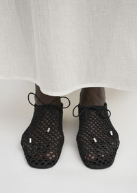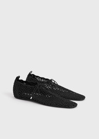 TOTEME ballerinas reworked in intricate crochet nodding to the collection's artisanal tone. They have an elasticated drawstring to secure the top edge and are set on a leather insole and sole. Wear them throughout summer with dresses. Details & Fit - Black - Elasticated drawcord, silver aglets - Leather insole and sole - 100% polyester recycled; lining: 100% sheep leather; sole: 100% cow leather - Care instructions and dust bag included - Style number 253-WAS2358-YA0200 - True to size