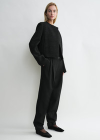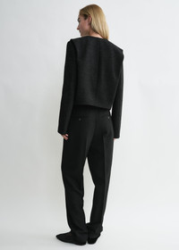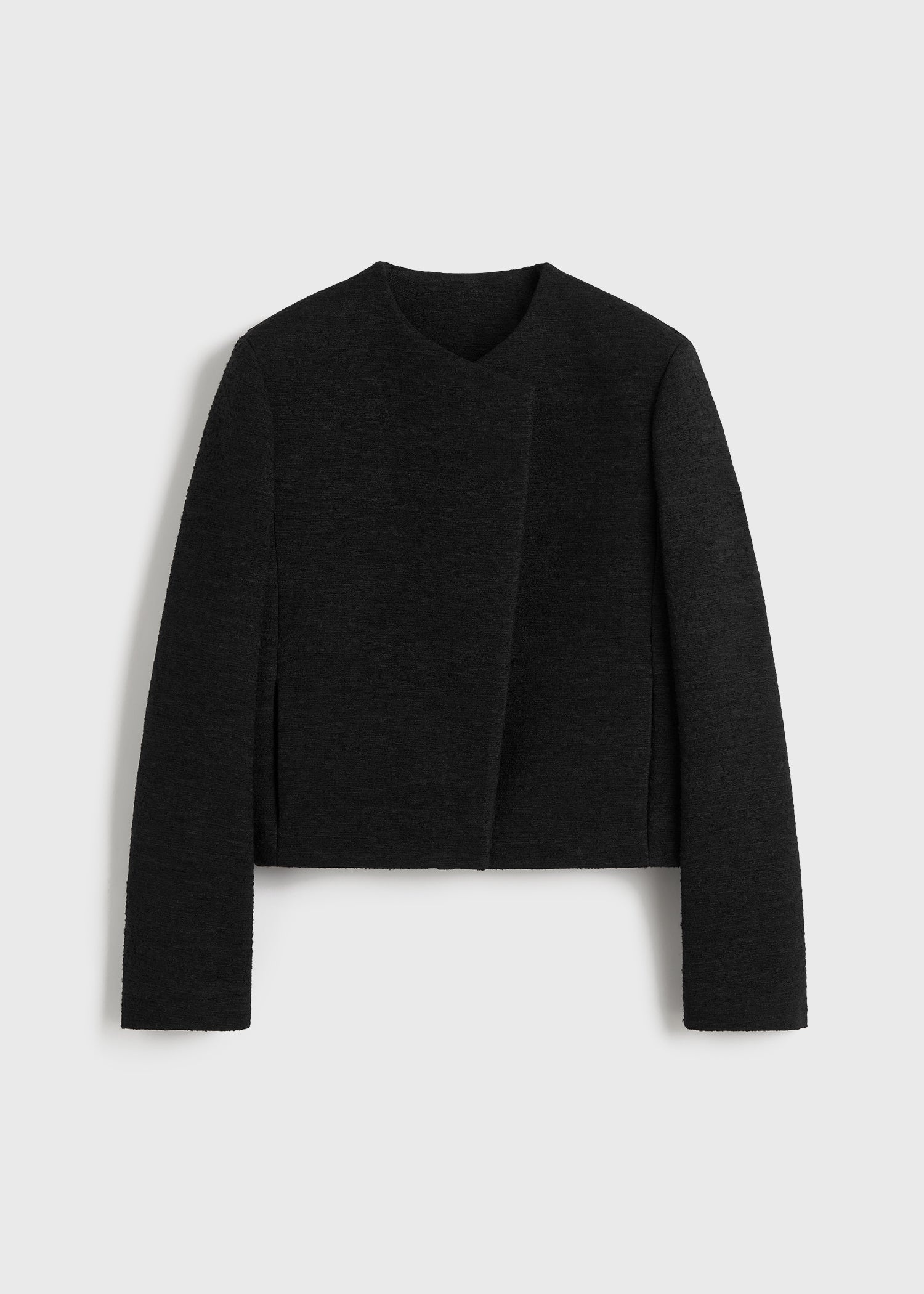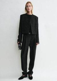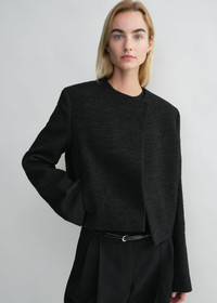 TOTEME evening jacket featuring an asymmetric front as an understated off-kilter touch. It is crafted from an irregular boucle fabric to a slightly cropped, boxy silhouette with a subtly curved back and is fully lined for a structured fit. Team it with trousers for a gallery opening. Details & Fit - Black - Open front - Curved sleeves and back - Viscose lining - 41% polyester, 22% acrylic recycled, 18% polyester recycled, 9% wool recycled, 8% wool, 2% other fibers; lining: 100% viscose - Dry clean - Style number 251-WRO4309-FB0271 - The model is 179cm/5'10" tall and wears a size 36 - True to size, boxy fit