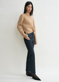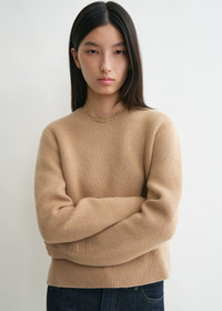 TOTEME winter sweater knitted to a double construction with warm cashmere on the outside and temperature-regulating merino wool on the inside. It has a slightly cropped, petite frame finished with ribbing at the crew neck, cuffs and hem. Note the discreet monogram embroidered onto the sleeve. Details & Fit - Camel - Extra-long sleeves, embroidered monogram - Cropped hem, side slits - Ribbed edges - 53% cashmere, 44% wool RWS, 3% elastane - Cool hand wash - Style number 244-WRT0404-YA0126 - The model is 180cm/5'11 tall and wears a size S - True to size, petite fit