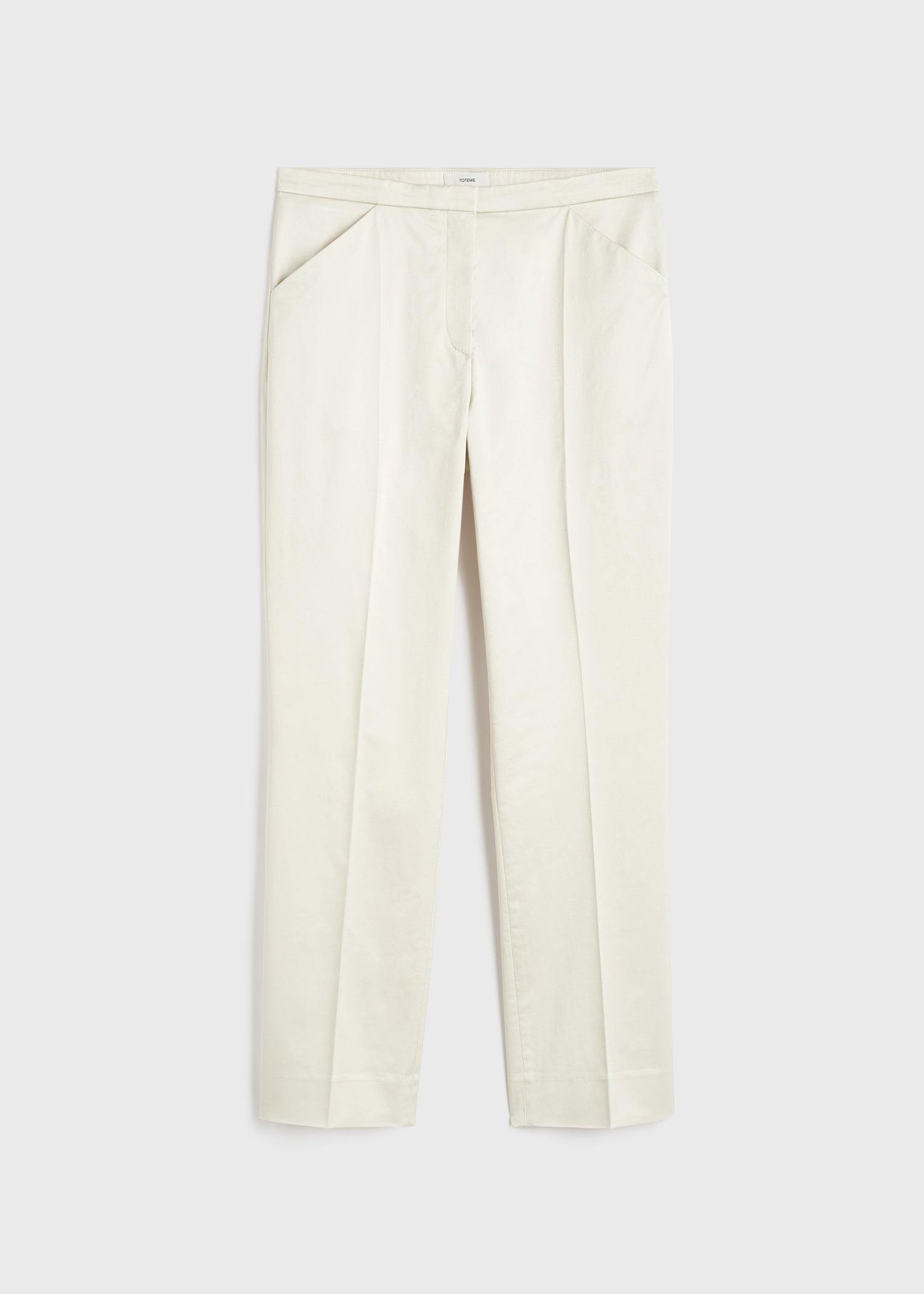 New TOTEME trousers cut to a cropped straight silhouette with pressed legs. They are crafted from light cotton-blend satin infused with a touch of elastane for comfort and feature a slim waistband, slanted front pockets and a concealed zipper fly. Pair them with heeld sandals to go out to dinner. Details & Fit - Ecru - Satin waistband - Slanted front pockets - Zipper fly - 54% cotton organic, 41% viscose, 5% elastane - Dry clean - Style number 252-WRB0248-FB0391 - The model is 178cm/510 tall and wears a size 36 - True to size, low waist