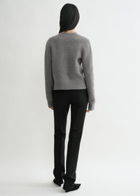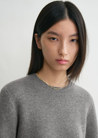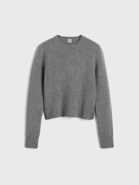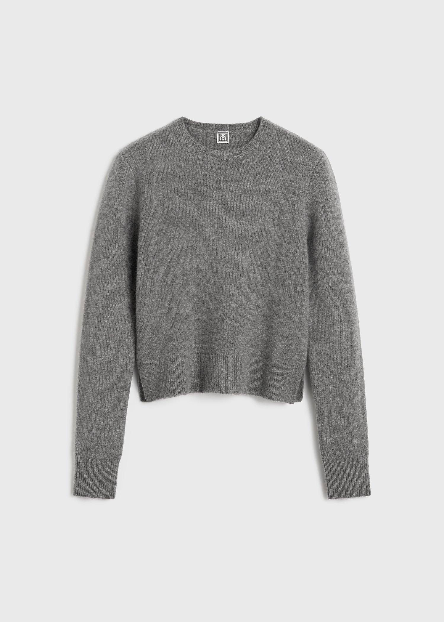TOTEME winter sweater knitted to a double construction with warm cashmere on the outside and temperature-regulating merino wool on the inside. It has a slightly cropped, petite frame finished with ribbing at the crew neck, cuffs and hem. Note the discreet monogram embroidered onto the sleeve. Details & Fit - Grey melange - Extra-long sleeves, embroidered monogram - Cropped hem, side slits - Ribbed edges - 53% cashmere, 44% wool RWS, 3% elastane - Cool hand wash - Style number 244-WRT0404-YA0126 - The model is 180cm/5'11 tall and wears a size S - True to size, petite fit