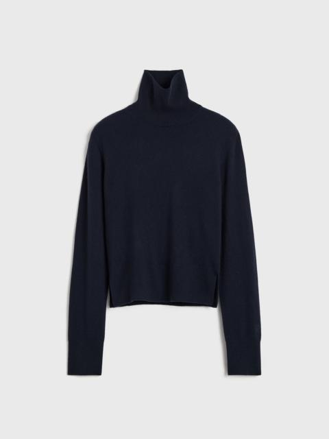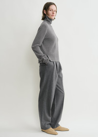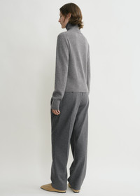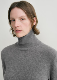 TOTEME turtleneck sweater presented in a cropped, petite silhouette as a new take on our wardrobe staples. It is knitted from light cashmere with ribbed edges and has a discreet monogram on the sleeve and side hem slits for an impeccable drape. Team it with tailored trousers. Details & Fit - Grey melange - Extra-long sleeves, embroidered monogram - Cropped hem, side slits - Ribbed edges - 100% cashmere - Cool hand wash - Style number 244-WRT0405-YA0016 - The model is 178cm/510 tall and wears a size S - True to size, petite fit