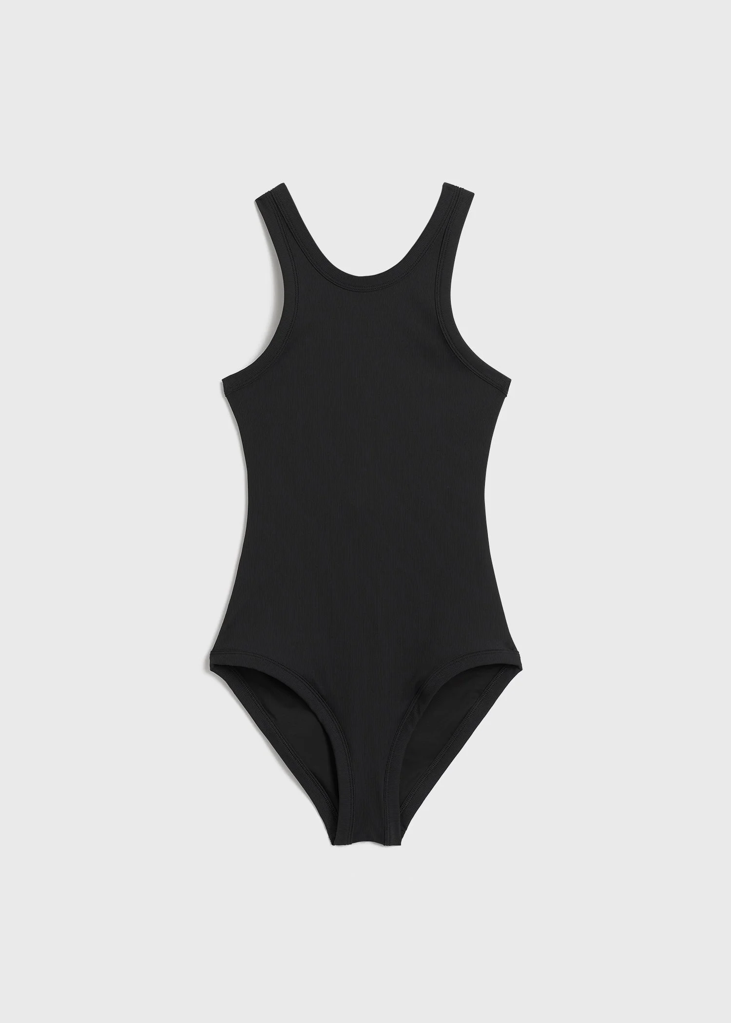 The iconic TOTEME Curved rib tank is transformed into a modern swimsuit with curved armholes and subtle ribbing for a sporty feel. It is made from second-skin jersey with full lining and a concealed back zipper. Wear it for a morning swim. Details & Fit - Black - Concealed back zipper - Full lining - 92% polyamide, 8% elastane - 30°C machine wash - Style number 252-WRW0052-FB0409 - The model is 178cm/510 tall and wears a size S - True to size