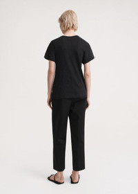 Signature TOTEME T-shirt made in Portugal from soft, light and fresh linen jersey. It’s designed for a relaxed slim fit with a round neck, curved armhole seams which add structure to the sleeves, and a front monogram embroidery. Team it with anything from relaxed denim to tailored trousers. Details and fit - Black - Curved shoulder seams - Embroidered monogram - 100% Linen - Cool hand wash - Style number 233-5055-253 - The model is 178cm/5’10” tall and wears a size XS - True to size